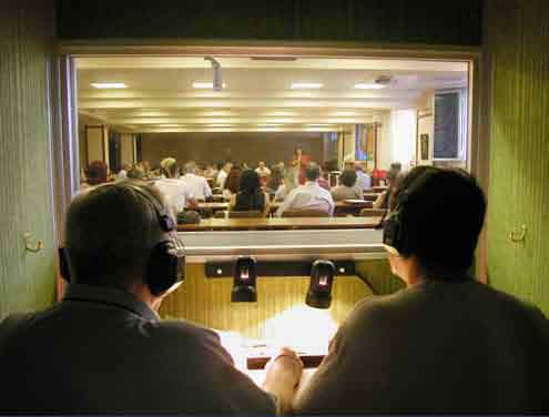 發(fā)言人講話時不用間斷,同傳譯員邊聽邊譯。譯員通常在隔音同傳箱里實時口譯,聽眾通過耳機收聽譯員講話。